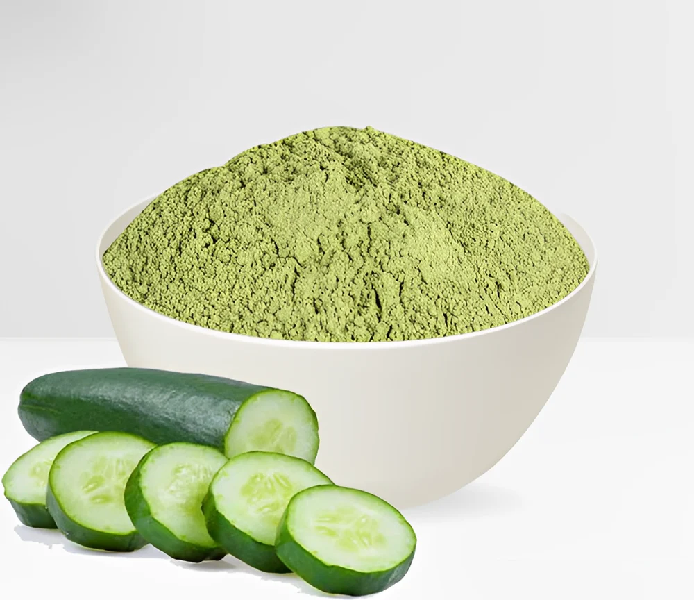 Cucumber powder is a natural product obtained by drying and pulverizing fresh cucumbers (Cucumis sativus). It retains many of the nutrients, flavor, and aroma of the fresh vegetable.