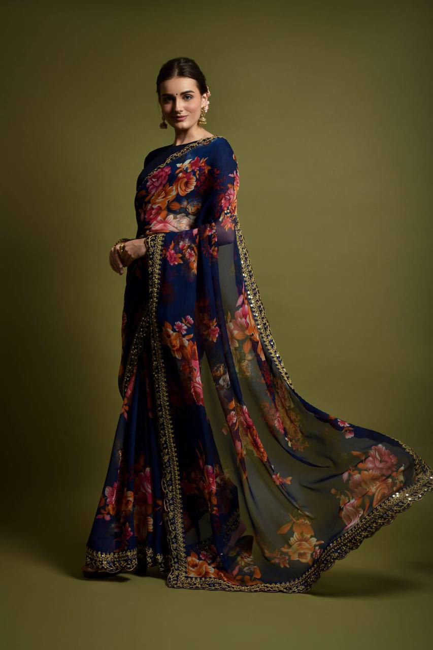 Saree Fabric: Georgette chiffon with flower print and foil work